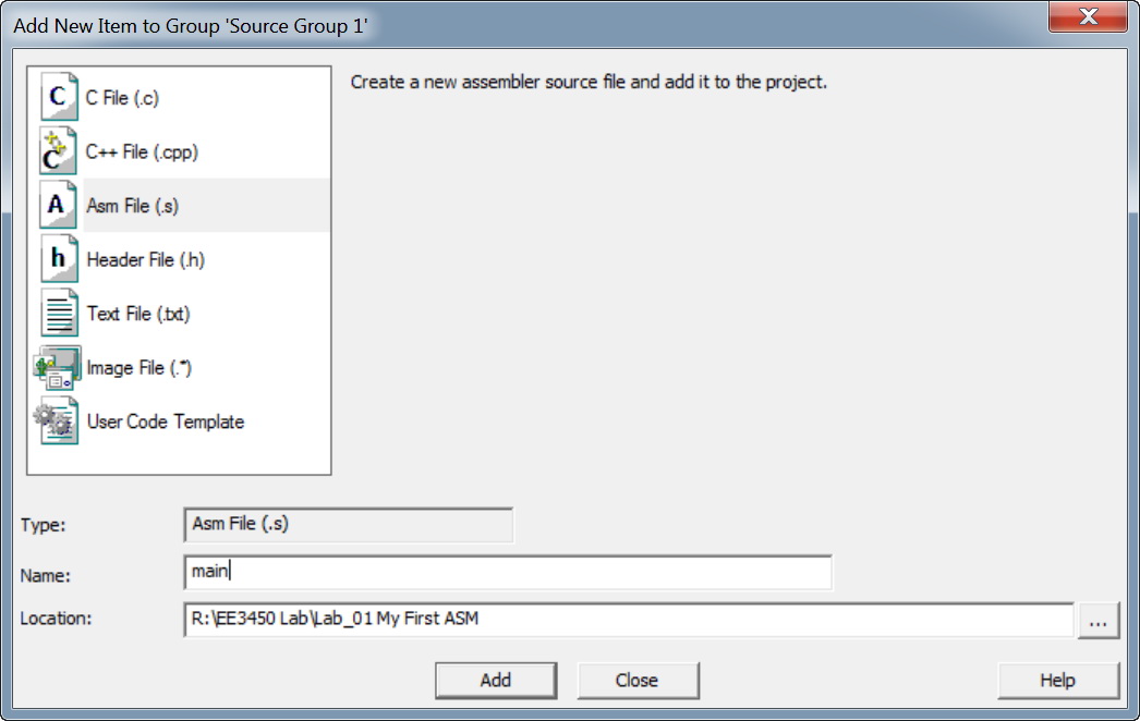 - In the pop-up dialog, select file type to Asm File (.s), enter Name "main". Click on "Add" button