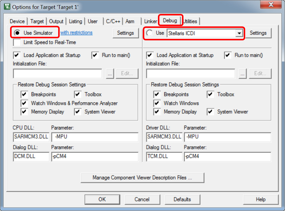 - For in-circuit hardware debugger, click on "Use:" and select debugger interface to "Stellaris ICDI"
