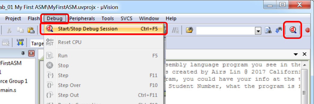 Debug Menu Toolbar Shortcut Description Start/Stop Debug Session