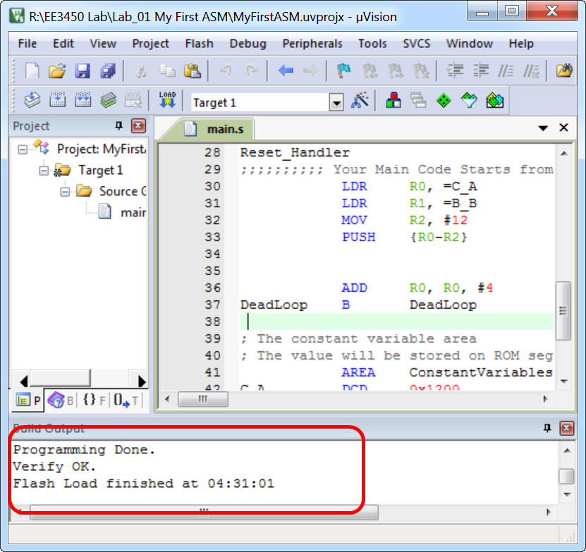 - Check any error message in the "Build output" window. If Keil shows "Flash Load finished..." message, then you can press "RESET" button on the Tiva board to start you program on the hardware.