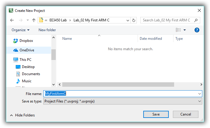 - In the main μVision menu, select Project ➤ New µVision Project. The Create New Project window opens up.