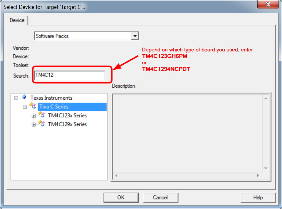 - The Select Device for Target 'Target1'... window opens, and you have to select which processor family will be usedEK-TM4C123GXL board: from the list of devices select "Texas Instruments ➤ Tiva C Series ➤ TM4C123x Series" and from the new list select TM4C123GH6PM. Click OK