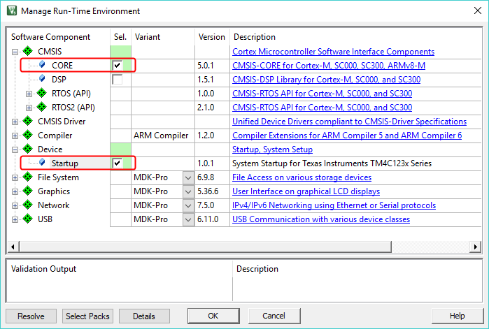 Two components must be selected for the Tiva LaunchPad board in your C project. In the Manage Run-Time Environment window, select the following components for your project: