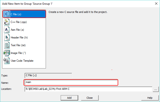 - In the open window, select the file type to C File (.c), and enter the Name "main.c". Click on "Add".