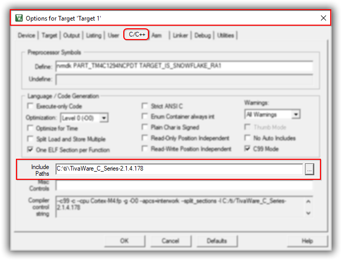 (c) Add the top-level TivaWare directory (C:\ti\TivaWare_C_Series-2.1.4.178) to the Include paths field.