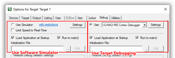 - Enable Load Application at Startup for loading the application into the μVision debugger whenever a debugging session is started.