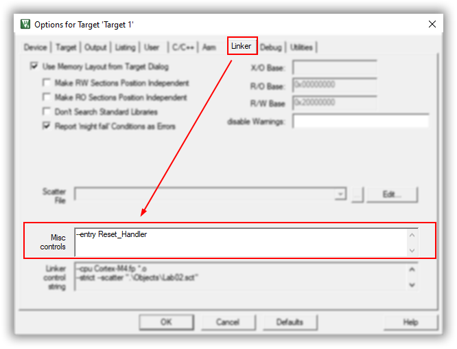 (d) In the Link tab, add --entry Reset_Handler definition on Misc controls.