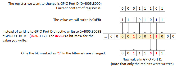 If you write an 8-bit value directly to the DATA register, all eight pins will be modified. If you only want to modify specific pins of this port, you must read the values of all pins from the DATA register, use a bitwise operator to change the specific bits, and then write the modified value back to the port. This is called a read-modify-write operation, and it's fraught with issues. For instance, if an interrupt changed the pin state in the middle of this process, your code would write the wrong value to the pin.