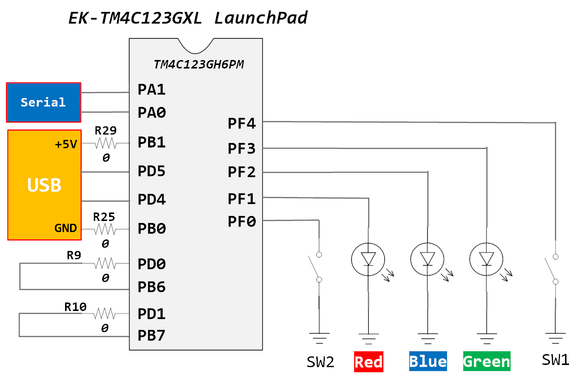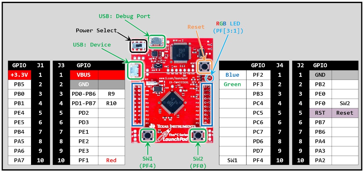 The microcontroller on the EK-TM4C123GXL LaunchPad is TM4C123GH6PM. The TM4C123GH6PM GPIO module is comprised of six physical GPIO blocks, each corresponding to an individual GPIO port (Port A, Port B, Port C, Port D, Port E, and Port F).
