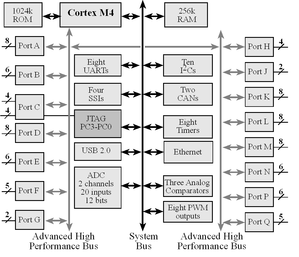 Figure 1: I/O Port Pins for the TM4C123GH6PM (From http://users.ece.utexas.edu/~valvano/Volume1/E-Book/C6_MicrocontrollerPorts.htm)