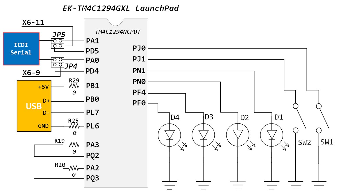 The following source code is to turn on the onboard switches and LEDs on PORTF, PORTN, and PORTJ