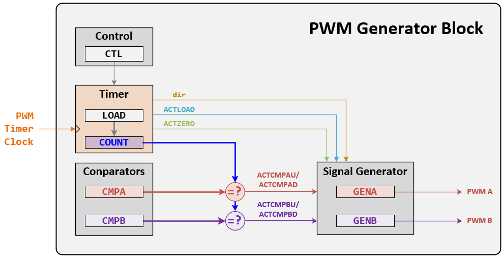 Each PWM generator block produces two PWM signals that share the same PWM timer and frequency and can either be programmed with independent actions or as a single pair of complementary signals. The output signals, GENA and GENB, of the PWM generation blocks are managed by the output control block before being passed to the device pins.