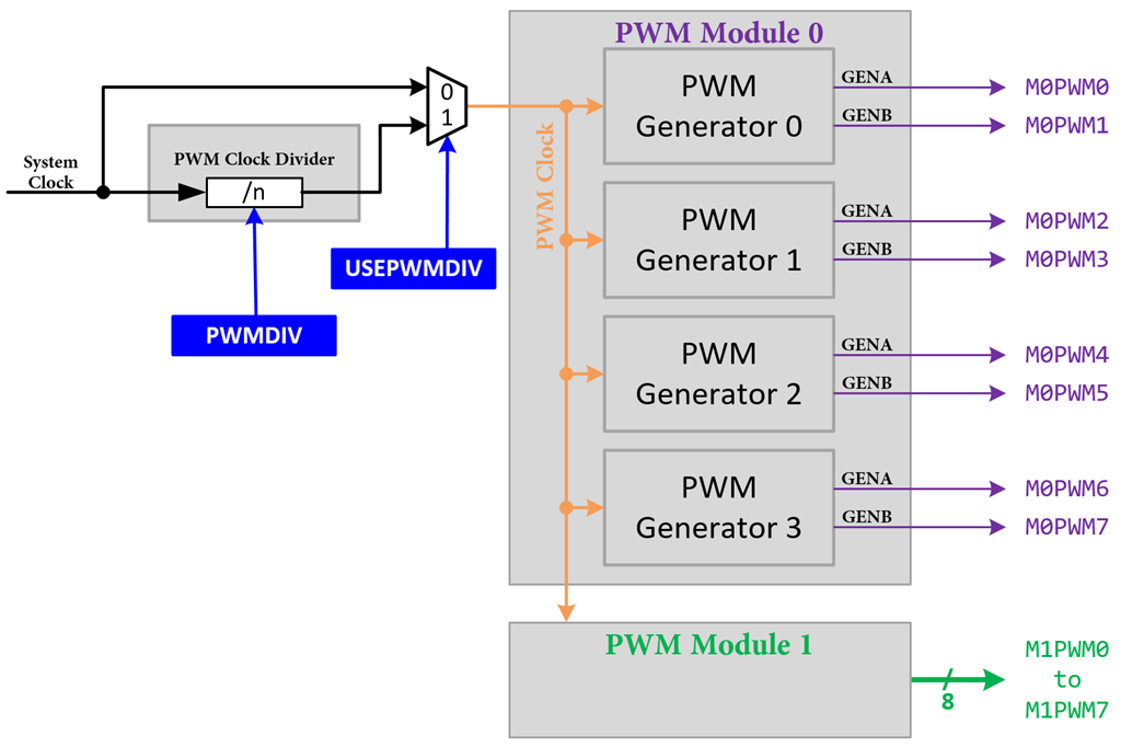 - Enable the PWM clock by setting its corresponding bit in the SYSCTL_RCGCPWM register, then waiting for the PWM clock to ready by checking the SYSCTL_PRPWM register