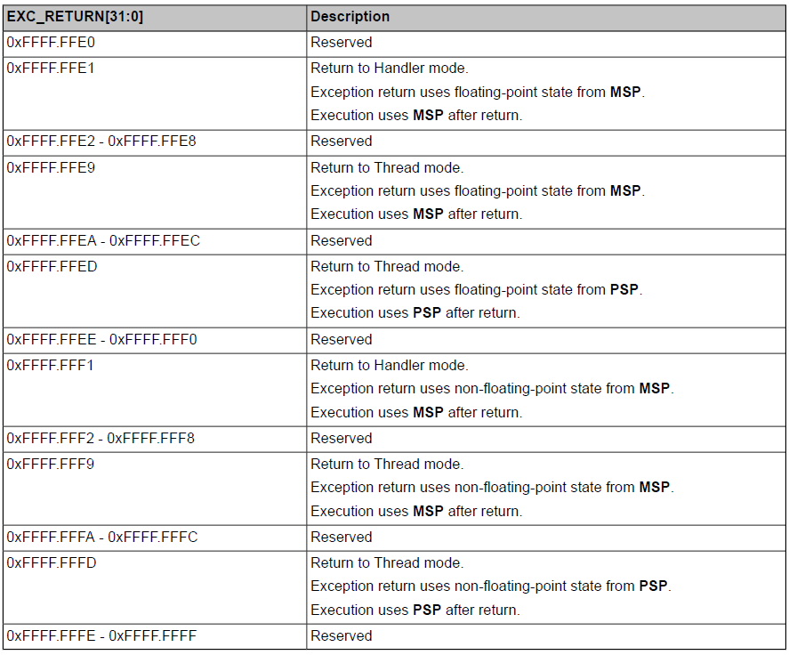 - The EXC_RETURN value is loaded into the R14 (LR) on interrupt entry. The EXC_RETURN bits [31:5] are all set. Bits [4:1] provide information on the return stack, bit [0] is always 1 on Cortex-M meaning Thumb mode. Click here to see the detail EXC_RETURN values.