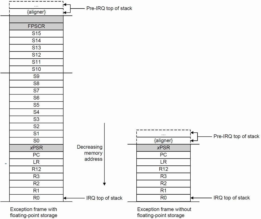 - Push eight registers on the stack: R0, R1, R2, R3, R12, R14 (LR), R15 (PC) and xPSR with R0 on top. If the floating point unit (FPU) is active, an additional 18 words will be pushed on the stack. The stack frame layout is shown as the following diagram