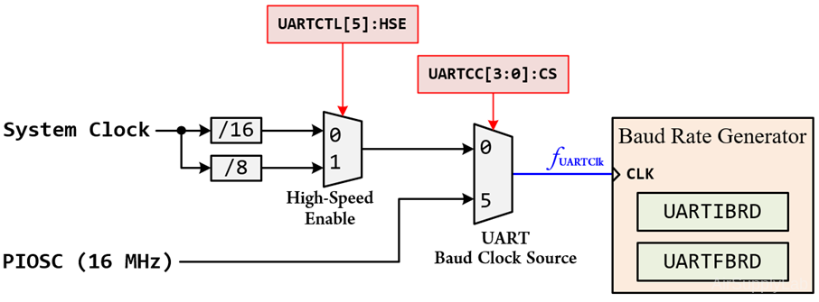 | 5 | X | 0 | ${f_{UARTClk}} = PIOSC = 16MHz$ |