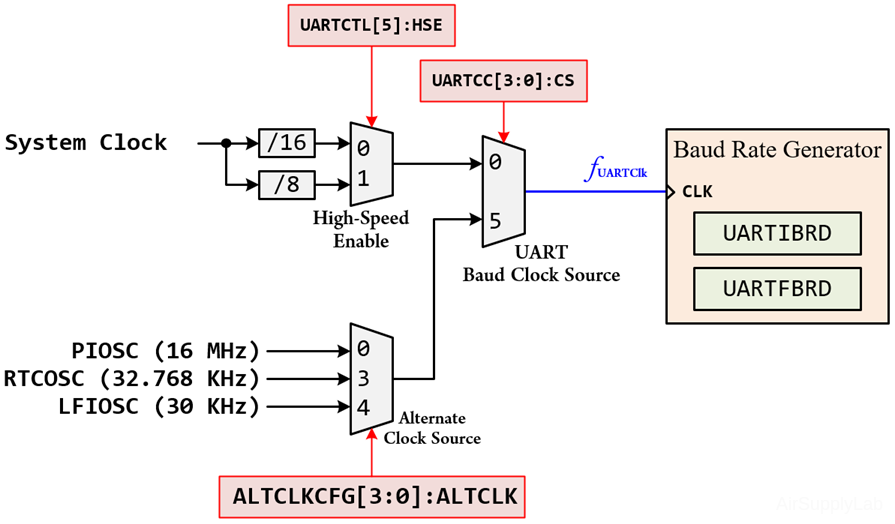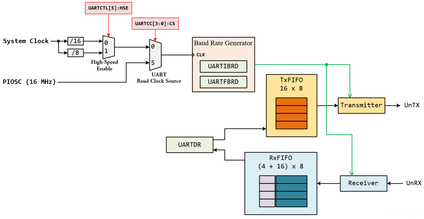 The UART clock source can be configured from the main system clock, the internal precision oscillator (PIOSC), or other clock selections.