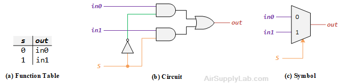 Figure 2 (b) shows a sum-of-products circuit that implements a 2-to-1 multiplexer with a select input s. If s = 0, the output of the multiplexer (out) is equal to the input in0; if s = 1, the output is equal to in1. Part (a) of the figure gives a function table for this multiplexer, and part (c) shows its circuit symbol.