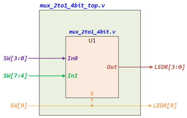 - Create a new Verilog HDL file to implement the top-level module. Type the following Verilog and complete the connections based on Figure 7, then save it to mux_2to1_4bit_top.v