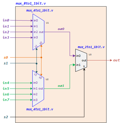 Figure 8: Build an 8-to-1 1-bit MUX using Two 4-to-1 and One 2-to-1 MUXs