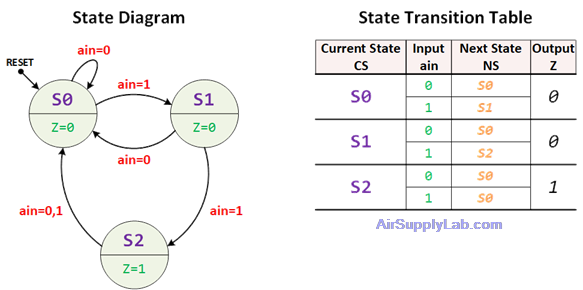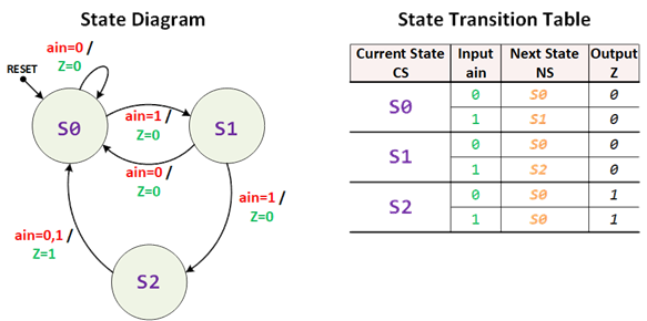 While a state diagram gives a visual overview, the state transition table provides the precise logic needed to write Verilog case statements. Every row in the table maps directly to a case / if condition in the next-state always block.