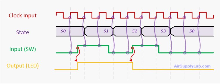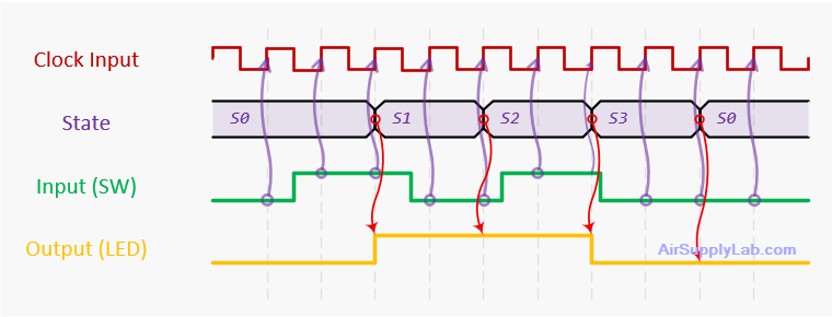 - Often 1-cycle latency: input → next_state → state update (clock edge) → output update.