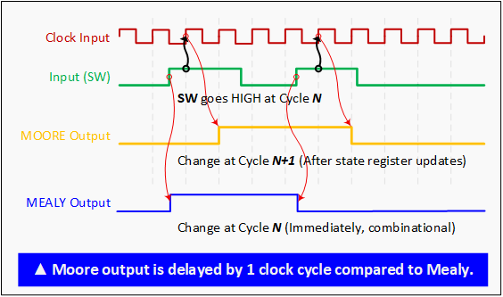 - Moore: output depends only on state → stable outputs, usually 1 clock later.